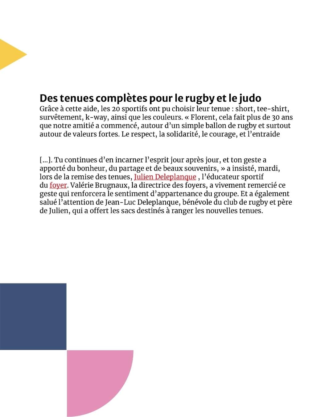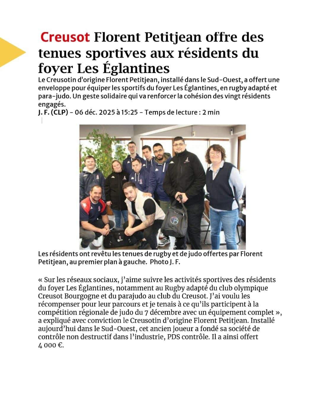Florent Petitjean, Creusotin d’origine aujourd’hui installé dans le Sud-Ouest, a souhaité soutenir les résidents engagés en rugby adapté et en para-judo en leur offrant des tenues sportives complètes. Il a évolué pendant plusieurs saisons avec le Sporting Club Decazevillois (club de rugby à XV en Aveyron).